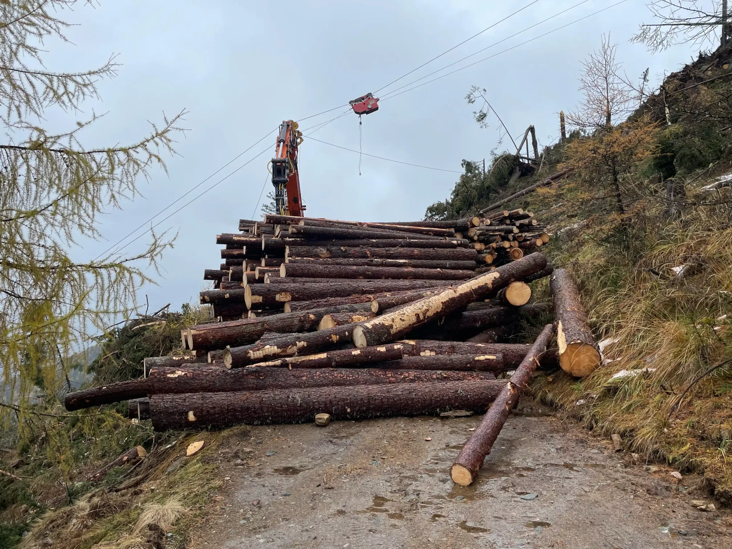 - Seilunterstützte Holzernte mit TST600 Gebirgsharvester mit Seilkran